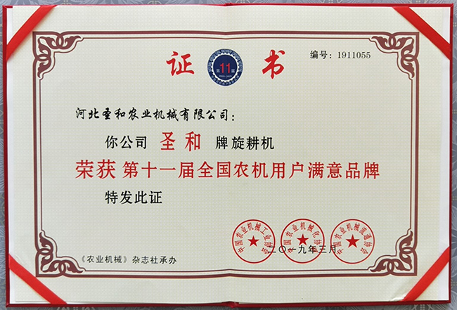 圣和旋耕機榮獲第十一屆滿意品牌證書