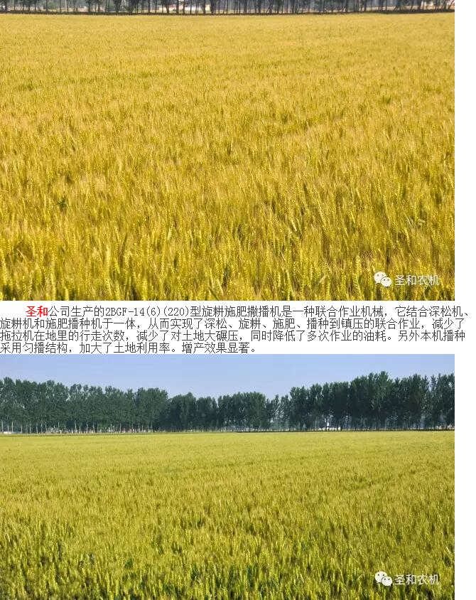 圣和公司生產(chǎn)的2BGF-14(6)(220)型旋耕施肥撒播機(jī)是一種聯(lián)合作業(yè)機(jī)械,它結(jié)合深松機(jī)、旋耕機(jī)和施肥播種機(jī)于一體,從而實(shí)現(xiàn)了深松、旋耕、施肥、播種到鎮(zhèn)壓的聯(lián)合作業(yè),減少了拖拉機(jī)在地里的行走次數(shù),減少了對(duì)土地大碾壓,同時(shí)降低了多次作業(yè)的油耗。另外本機(jī)播種采用勻播結(jié)構(gòu),加大了土地利用率。增產(chǎn)效果顯著。