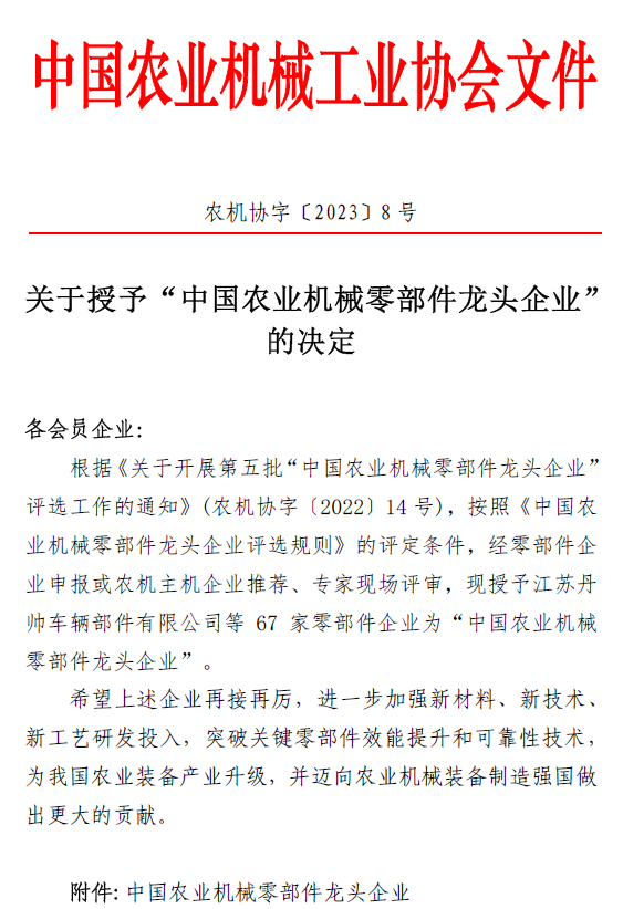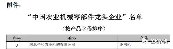 2023年3月9日,中國(guó)農(nóng)業(yè)機(jī)械工業(yè)協(xié)會(huì)發(fā)布關(guān)于授予“中國(guó)農(nóng)業(yè)機(jī)械零部件龍頭企業(yè)”的決定(農(nóng)機(jī)協(xié)字[2023]8號(hào)文件),河北圣和農(nóng)業(yè)機(jī)械有限公司位列榜單,以優(yōu)秀的配套還田機(jī)零部件而著稱。