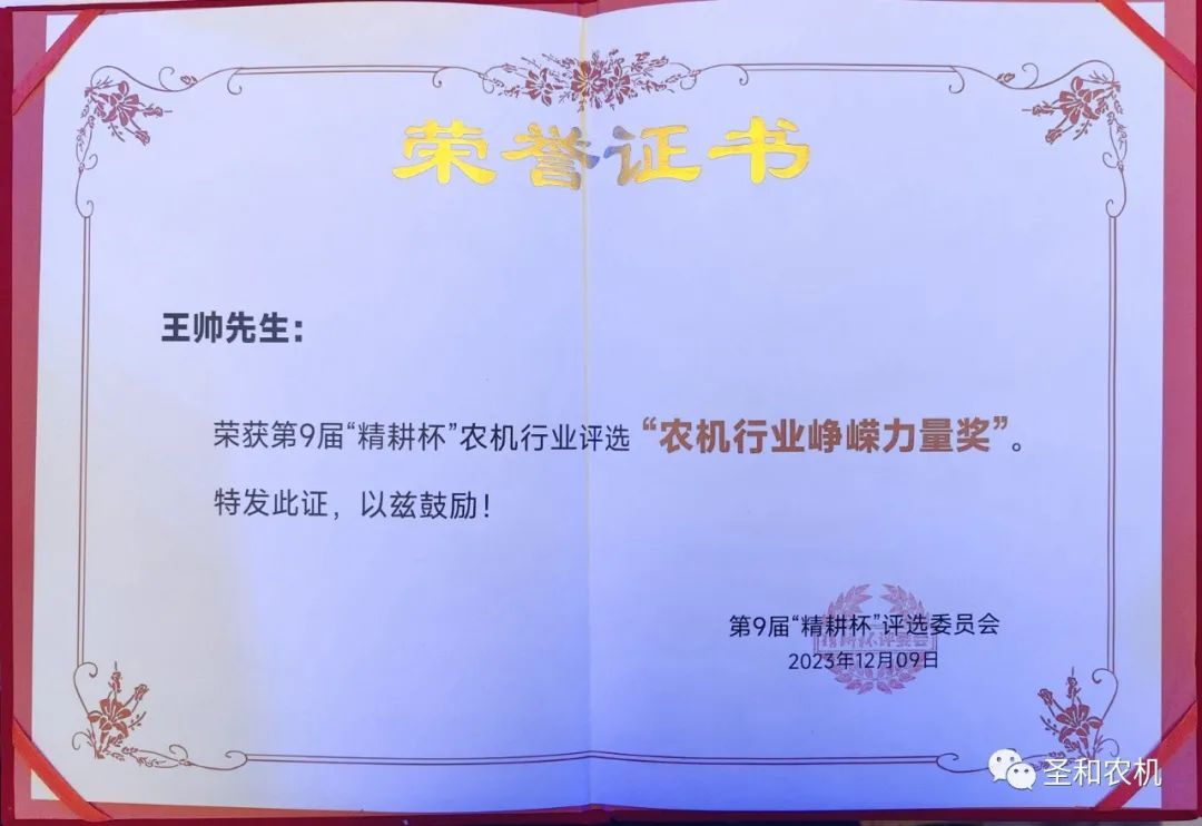 圣和公司能夠斬獲第九屆“精耕杯”的三項(xiàng)殊榮,實(shí)至名歸!三項(xiàng)獎(jiǎng)項(xiàng)更是眾多經(jīng)銷商、用戶、專家、全行業(yè)對圣和的認(rèn)可!圣和人將不忘初心,秉承匠心,以智能化、數(shù)字化為抓手,提供優(yōu)質(zhì)的產(chǎn)品和服務(wù),來回饋社會的厚愛,為鄉(xiāng)村振興貢獻(xiàn)一份力量。 “乘風(fēng)好去,長空萬里,直下看山河。”圣和公司的新藍(lán)圖振奮人心,新征程前景壯闊!