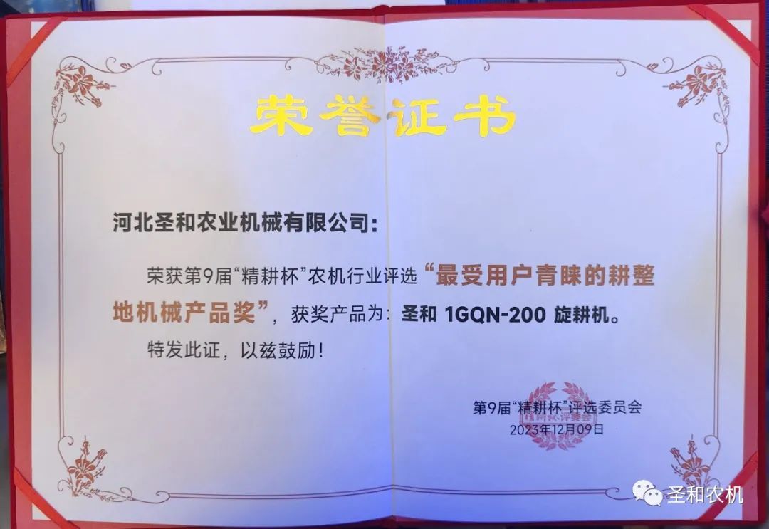 圣和品牌連續(xù)多年在“精耕杯”評選活動中屢獲殊榮。在本屆“精耕杯”評比中,“圣和”牌旋耕機(jī)再次憑借優(yōu)異的產(chǎn)品質(zhì)量、優(yōu)秀的售后服務(wù)、廣泛的群眾基礎(chǔ)、良好的用戶口碑,一舉奪得“最受用戶青睞的耕整地機(jī)械產(chǎn)品獎(jiǎng)”!同時(shí),也證明了圣和公司優(yōu)異的產(chǎn)品質(zhì)量、絕佳的全程服務(wù)得到了市場及用戶的青睞。