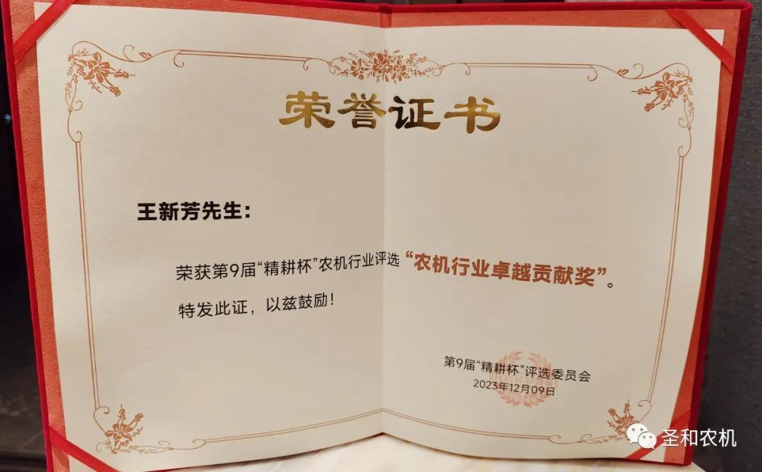 河北圣和農(nóng)業(yè)機(jī)械有限公司董事長王新芳榮膺本屆精耕杯“農(nóng)機(jī)行業(yè)卓越貢獻(xiàn)獎(jiǎng)”。評委會頒獎(jiǎng)詞為:他善于把握行業(yè)發(fā)展方向,有歷史使命感、有魄力。他心系“三農(nóng)”大膽創(chuàng)新,曾多次顛覆性、革命性地引導(dǎo)旋耕機(jī)的發(fā)展方向;他不忘初心,以實(shí)現(xiàn)農(nóng)機(jī)智能化、數(shù)字化為己任,籌建了河北省耕整地創(chuàng)新中心,推動了行業(yè)升級;他勇闖國際市場,打造“中國智造”新名片,30年在農(nóng)機(jī)行業(yè)默默奉獻(xiàn),為中國農(nóng)機(jī)行業(yè)發(fā)展作出了卓越貢獻(xiàn)。