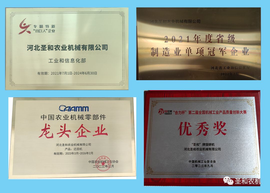 公司現(xiàn)為國家級專精特新“小巨人”企業(yè)、河北省“專精特新”示范企業(yè),省級制造業(yè)單項冠軍企業(yè),河北省首批縣域特色產(chǎn)業(yè)集群“領(lǐng)跑者”企業(yè)。公司擁有25項國家專利,參與制定多項國家標(biāo)準(zhǔn)。旗下?lián)碛?ldquo;圣和”、“普勞恩德”兩大品牌,產(chǎn)品遍布大江南北,行銷20多個國家和地區(qū)。其中旋耕機、還田機雙雙榮獲2022年度銷售冠軍,為中國耕整地機械行業(yè)的龍頭企業(yè)。