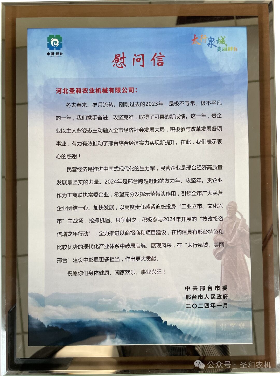 在新春佳節(jié)即將來臨之際,邢臺市委書記楊猛代表中共邢臺市委、邢臺市人民政府,給河北圣和農(nóng)業(yè)機械有限公司發(fā)來熱情洋溢的《慰問信》,并送上美好的祝福。