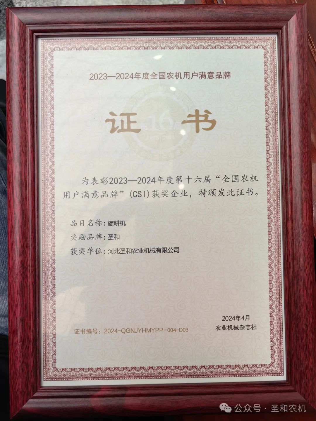 喜報:圣和牌旋耕機再次蟬聯(lián)“全國農(nóng)機用戶滿意品牌”年度大獎