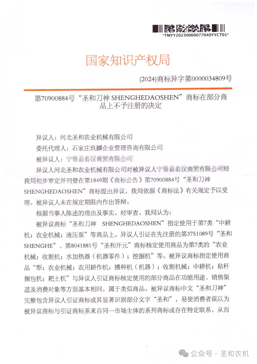 近年來,國家知識(shí)產(chǎn)權(quán)局從源頭治理,對商標(biāo)惡意搶注行為實(shí)施部門聯(lián)動(dòng)、精準(zhǔn)打擊,依法維護(hù)了市場主體的公平競爭,為營造良好的知識(shí)產(chǎn)權(quán)法治環(huán)境、市場環(huán)境和社會(huì)環(huán)境提供了保障。近日,國家知識(shí)產(chǎn)權(quán)局作出了不予核準(zhǔn)“圣和刀神”商標(biāo)注冊的決定【(2024)商標(biāo)異字第0000034809號(hào)】,就是打擊商標(biāo)惡意搶注行為的一次意志體現(xiàn)。