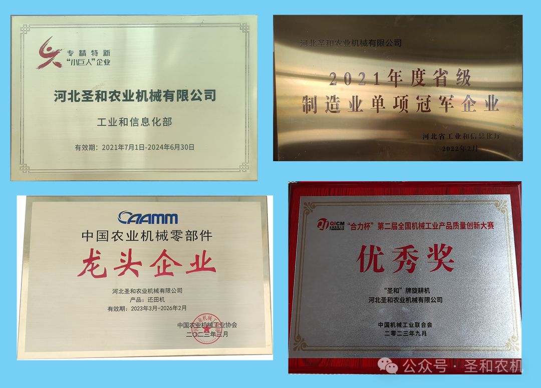 公司被授予國家級專精特新“小巨人”企業(yè)、河北省“專精特新”示范企業(yè)、河北省耕作機(jī)械技術(shù)創(chuàng)新中心依托單位、省級制造業(yè)單項(xiàng)冠軍企業(yè)、河北省首批縣域特色產(chǎn)業(yè)集群“領(lǐng)跑者”企業(yè)名單。身處行業(yè)當(dāng)中,圣和公司積極參與和承擔(dān)行業(yè)、協(xié)會等發(fā)起各項(xiàng)產(chǎn)品的標(biāo)準(zhǔn)起草編寫工作,推動了行業(yè)發(fā)展。