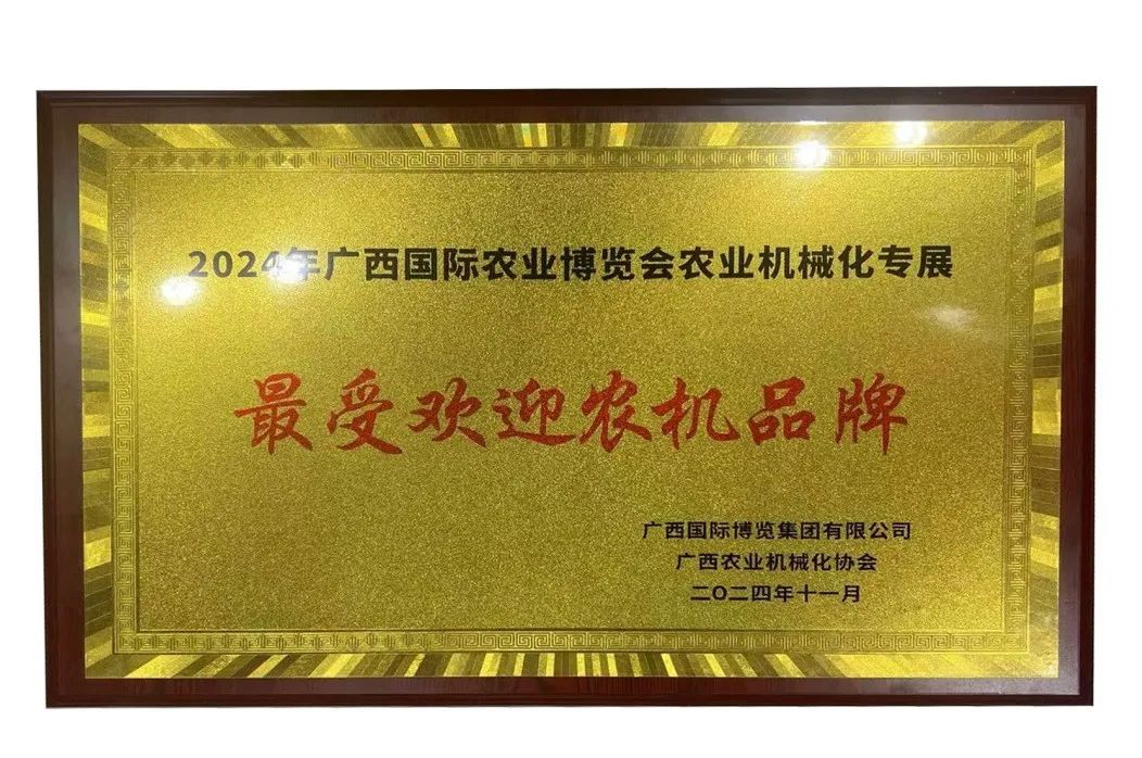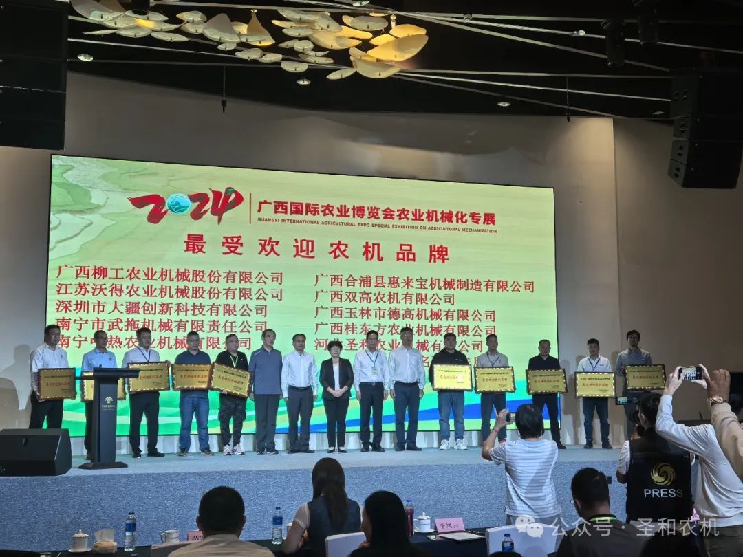 為大力宣傳和推介近年來在促進(jìn)廣西農(nóng)業(yè)機(jī)械化發(fā)展中受市場認(rèn)可、用戶歡迎的農(nóng)機(jī)企業(yè)(品牌)和產(chǎn)品,營造“制好機(jī)、選好機(jī)、用好機(jī)”的農(nóng)機(jī)化良性發(fā)展環(huán)境和社會(huì)氛圍。廣西國際博覽集團(tuán)有限公司與廣西農(nóng)業(yè)機(jī)械化協(xié)會(huì)自2024年10月就開始組織了“2024廣西國際農(nóng)業(yè)博覽會(huì)農(nóng)業(yè)機(jī)械化專展最受歡迎農(nóng)機(jī)品牌”評(píng)選活動(dòng)。在激烈的評(píng)選競爭中,“圣和”品牌不負(fù)眾望,最終斬獲“2024廣西國際農(nóng)業(yè)博覽會(huì)農(nóng)業(yè)機(jī)械化專展最受歡迎農(nóng)機(jī)品牌”榮譽(yù)稱號(hào)。在博覽會(huì)期間,圣和公司申江卓經(jīng)理代表公司出席頒獎(jiǎng)儀式,并上臺(tái)領(lǐng)獎(jiǎng)。