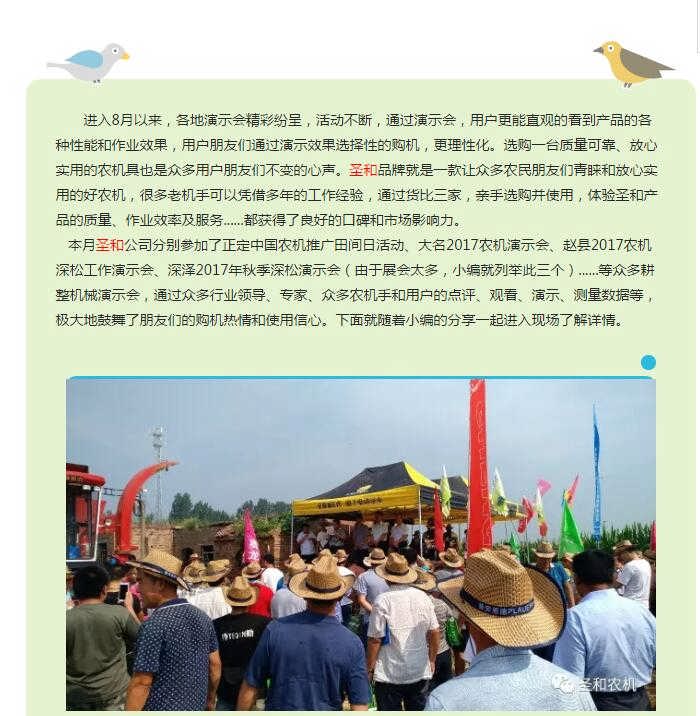 作為國家旋耕機(jī)標(biāo)準(zhǔn)起草單位、河北省著名商標(biāo)、河北省優(yōu)質(zhì)產(chǎn)品、更是一家集生產(chǎn)、研發(fā)、流通為一體的科技型企業(yè),深松旋耕機(jī)、雙軸滅茬旋耕機(jī)安全標(biāo)志及防護(hù)裝置示范單位”、“中國旋耕機(jī)協(xié)會(huì)理事長單位”、“中國農(nóng)業(yè)機(jī)械化協(xié)會(huì)會(huì)員單位”、“中國農(nóng)業(yè)機(jī)械流通協(xié)會(huì)理事單位”、“河北省生產(chǎn)與流通協(xié)會(huì)常務(wù)理事單位”、“河北工業(yè)大學(xué)機(jī)械工程學(xué)院-產(chǎn)、學(xué)、研合作基地”,擁有市級(jí)研發(fā)中心,公司一直致力于保護(hù)性耕整耕種機(jī)具的研發(fā),在中國農(nóng)機(jī)具研發(fā)領(lǐng)域取得特別優(yōu)異的成果,目前已經(jīng)有近百種的農(nóng)機(jī)產(chǎn)品在全國范圍內(nèi)享受農(nóng)機(jī)購置補(bǔ)貼,部分產(chǎn)品走出國際市場,遠(yuǎn)銷海外,并受到一致好評(píng)。不斷更新,不斷完善,不斷進(jìn)取......立足長遠(yuǎn)發(fā)展于未來,圣和-您信賴的農(nóng)機(jī)品牌!買農(nóng)機(jī)、選圣和!