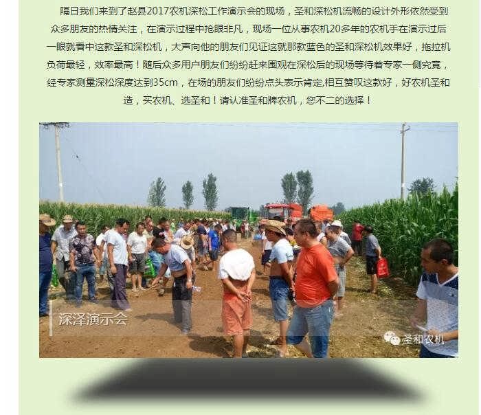 經(jīng)過輾轉(zhuǎn)我們又來到了深澤2017年秋季深松演示會(huì)的現(xiàn)場為您帶來一線現(xiàn)場的深松、耕整盛況:多家玉米收獲機(jī)演示過后,觀眾為接下來的耕整機(jī)械吊足了胃口,圣和1SS-270型深松機(jī)閃亮登場,氣質(zhì)不凡的“小伙兒”蓄勢待發(fā),一口氣卯足了勁,三加五除二的快速深松過去,現(xiàn)場觀眾還沒來得及過足癮就完成任務(wù)!此前多位農(nóng)民朋友就已經(jīng)有意選購如此如意產(chǎn)品,都在等待這場令人矚目和期待的演示會(huì),看到如此演示效果,笑容變得更加燦爛,紛紛表示再來一圈!經(jīng)過大伙的測量深松深度達(dá)到了將近38cm左右!在隨后普勞恩德(河北)農(nóng)業(yè)機(jī)械有限公司生產(chǎn)的普勞恩德PLAUERN旋耕機(jī)受到朋友們的高度關(guān)注,它采用德國技術(shù),實(shí)現(xiàn)了旋耕機(jī)質(zhì)的飛躍---采用流線型設(shè)計(jì),零部件靜電等離子噴涂,整機(jī)流水線組裝,加工時(shí)依靠工裝、模具保證零部件的尺寸精度(側(cè)板沖壓成型、一次沖孔;刀軸焊后加工;主梁焊后加工),從而保證了整機(jī)裝配精度;上蓋板為圓弧活蓋式,使刀軸回轉(zhuǎn)上腔體空間加大,作業(yè)中甩起的泥土不易粘結(jié),同時(shí)有利于維修保養(yǎng);采用加重型刀庫,精密鑄造成型;采用日本進(jìn)口刀片,持久耐用。廠內(nèi)安裝刀片,交付用戶以后,不用再為刀片錯(cuò)裝而煩惱。變速箱逐臺(tái)進(jìn)行磨合試驗(yàn),刀軸旋轉(zhuǎn)靈活,旋耕機(jī)作業(yè)時(shí)可節(jié)省8~10馬力。刀軸采用機(jī)器人焊接,雙層迷宮槽式防塵罩,有效保護(hù)軸承不受惡劣作業(yè)環(huán)境的影響,延長了使用壽命。加寬后托板,確保達(dá)到最佳平地效果。防磨板采用加寬、加大結(jié)構(gòu),可根據(jù)地域要求選擇配裝。側(cè)板兩側(cè)可選裝切草刀,斬?cái)?、分離工作中堆積的草團(tuán)。整機(jī)覆膜、木箱包裝,既保護(hù)了整機(jī)外觀的亮麗如新,又節(jié)省了運(yùn)輸、儲(chǔ)存空間。真是買不知道,不用不知道,此次演示會(huì)獲得了眾多農(nóng)機(jī)合作社和老機(jī)手的充分肯定,圣和農(nóng)機(jī)以真實(shí)的用戶體驗(yàn),完美的演示效果讓在場的每個(gè)人都心悅誠服。