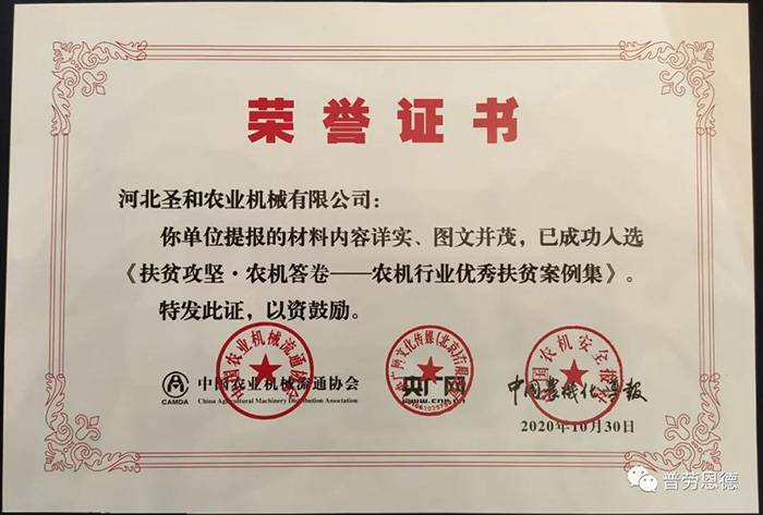 《農機行業優秀扶貧案例集》入選案例榮譽證書頒發儀式同期舉辦!河北圣和是唯一入選的河北生產企業!