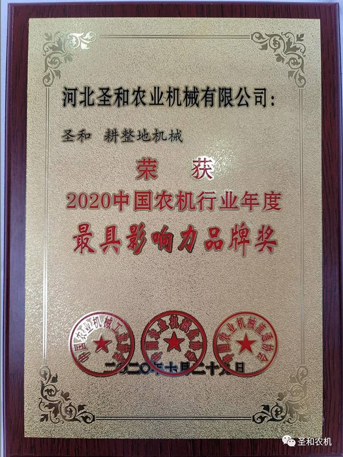 11月13日,“2020中國農機行業年度大獎頒獎儀式”在青島世界博覽城國際會展中心舉辦,河北圣和農業機械有限公司“圣和”品牌榮獲最具影響力品牌獎,也是全國農機行業耕整地機械類唯一獲獎企業品牌。