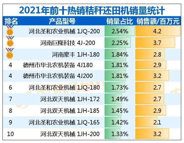 前十大暢銷秸稈粉碎還田機銷售3405臺,占總銷量的15%。
