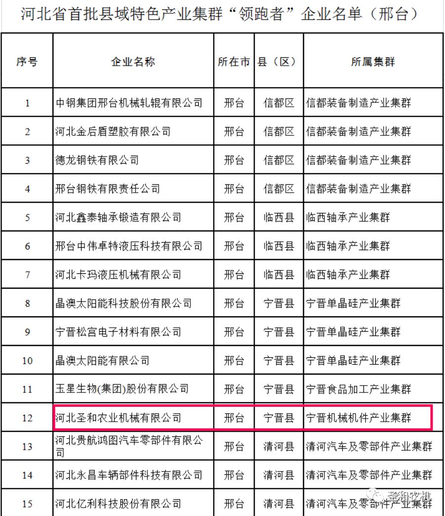 近日,河北省工業(yè)和信息化廳,公布了河北省首批縣域特色產(chǎn)業(yè)集群“領(lǐng)跑者”企業(yè)名單,邢臺(tái)市河北圣和農(nóng)業(yè)機(jī)械有限公司、晶澳太陽(yáng)能、中鋼邢機(jī)等25家企業(yè)入選。