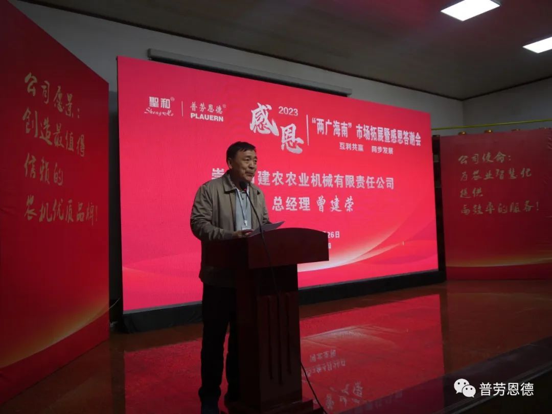 廣西崇左市建農(nóng)農(nóng)業(yè)機(jī)械有限責(zé)任公司總經(jīng)理曾建榮作為經(jīng)銷(xiāo)商代表進(jìn)行了發(fā)言。曾總分析了廣西農(nóng)業(yè)種植結(jié)構(gòu)和農(nóng)機(jī)市場(chǎng),希望圣和公司憑借其強(qiáng)大的公司實(shí)力和研發(fā)能力,開(kāi)發(fā)出適合當(dāng)?shù)馗鞯男缕窓C(jī)具,以填補(bǔ)市場(chǎng)空白。