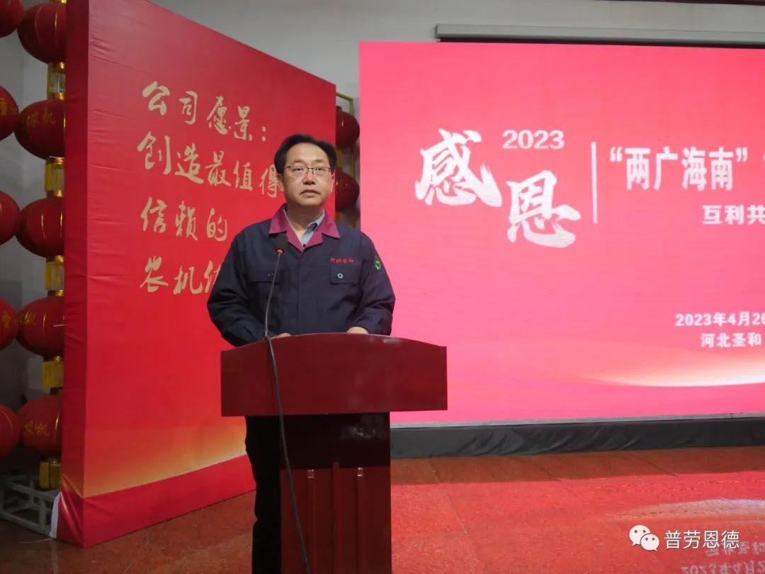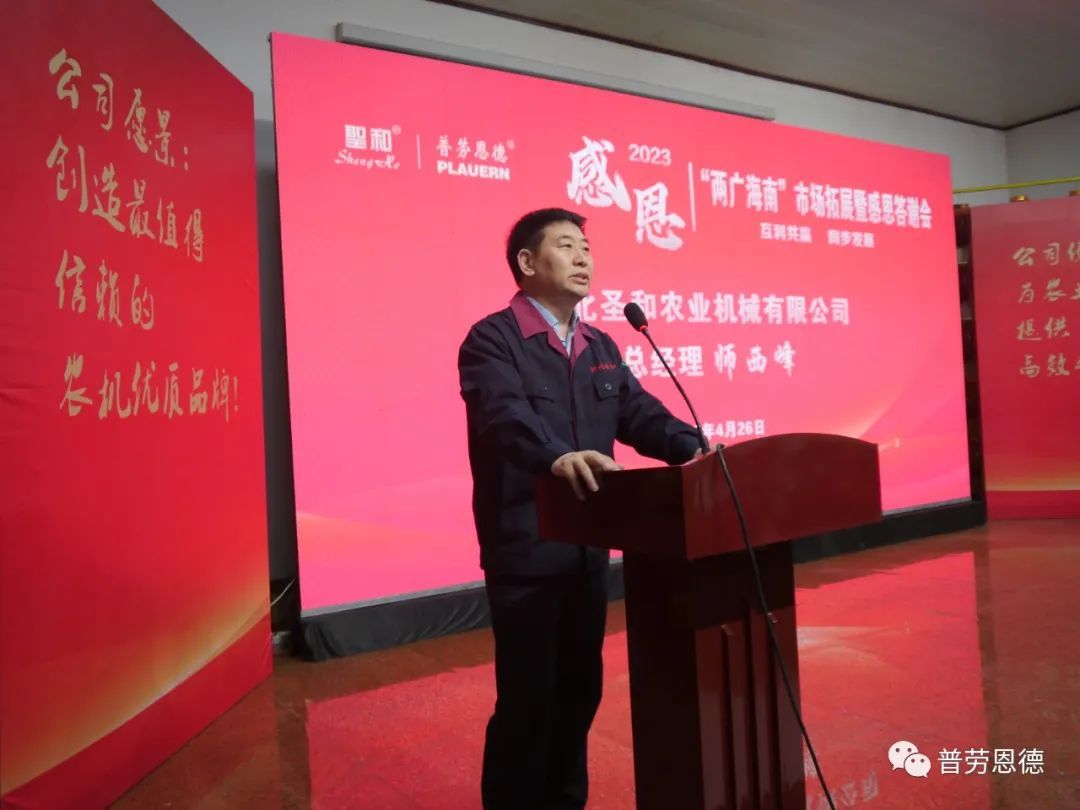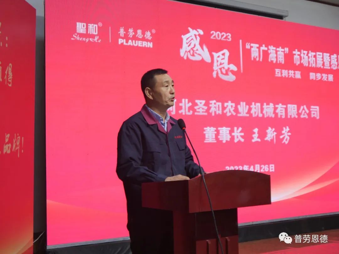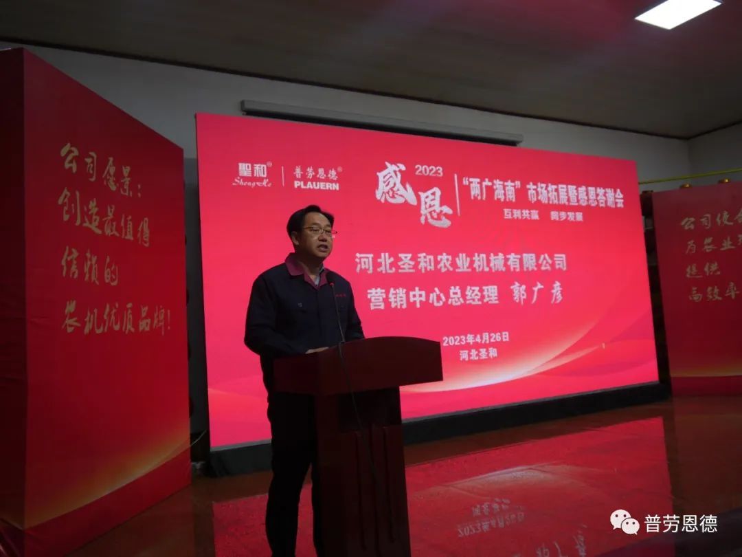 2023年4月26日,圣和公司歡聲笑語(yǔ),春意盎然。以“互利共贏,同步發(fā)展”為主題的河北圣和“2023年兩廣海南市場(chǎng)拓展暨感恩答謝會(huì)”在河北圣和農(nóng)業(yè)機(jī)械有限公司盛大舉行。100余位來(lái)自廣東、廣西、海南的經(jīng)銷(xiāo)商會(huì)師圣和,共襄盛舉。
