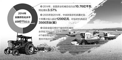 61%的農(nóng)機(jī)化率意味著我國(guó)農(nóng)業(yè)生產(chǎn)方式已實(shí)現(xiàn)由人力畜力為主向機(jī)械作業(yè)為主的歷史性跨越。2004年底,我國(guó)農(nóng)機(jī)化發(fā)展史上第一部法律《農(nóng)業(yè)機(jī)械化促進(jìn)法》正式實(shí)施。此后農(nóng)機(jī)化發(fā)展迎來(lái)了黃金十年,中央財(cái)政農(nóng)機(jī)購(gòu)置補(bǔ)貼10年累計(jì)投入超過(guò)1200億元,補(bǔ)貼農(nóng)機(jī)具超過(guò)3500萬(wàn)臺(tái)(套)。農(nóng)機(jī)化水平增幅超過(guò)法律實(shí)施之前35年的總和,農(nóng)機(jī)工業(yè)總產(chǎn)值從854億元增加到3571億元。